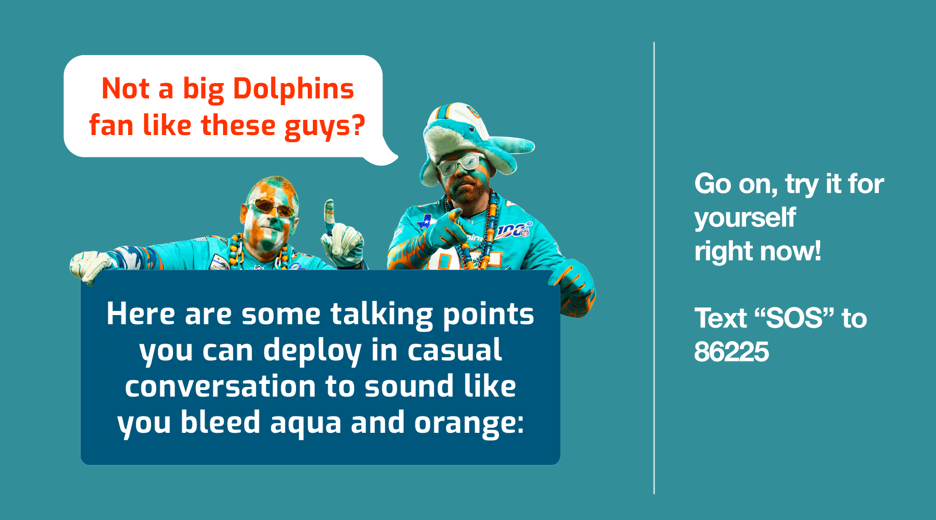 FanUp collaborated with the Miami Dolphins to develop an engaging fan interaction platform. The innovative campaign enabled supporters to text 'SOS' to 86225, resulting in a unique mobile experience tailored specifically for them.